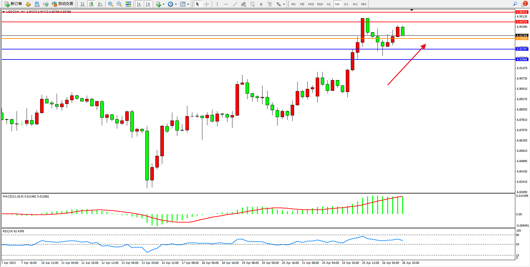 美元人民币USDCNH——4小时K线图显示: