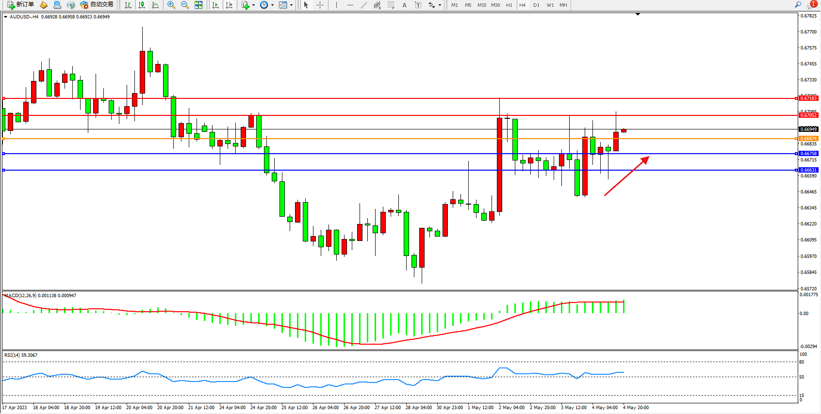 澳元兑美元维持0.66949附近震荡,澳大利亚10年期国债收益率下降8基点至3.332%;澳大利亚3月出口环比增长4%,3月贸易帐录得167亿澳元,