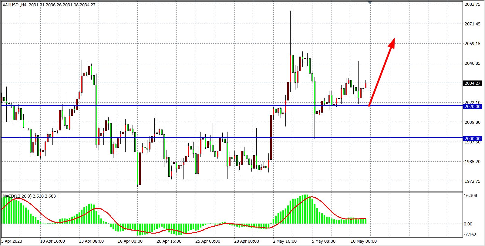 4小时图看,黄金维持在2020之上走高,同时MACD在零轴上均匀放量,趋势仍有望延续上涨,日内在2020之上看涨,目标2050-2070附近。