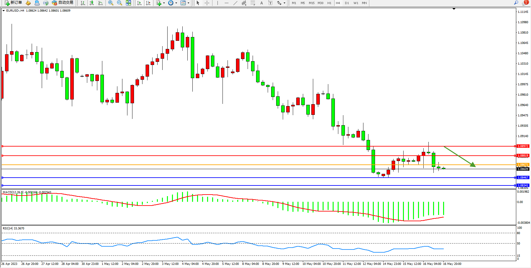 欧元美元EURUSD—4小时K线图显示: