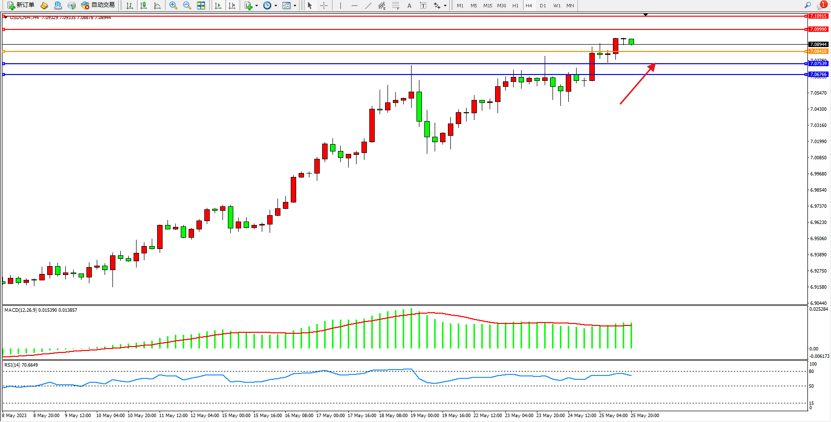 美元人民币USDCNH——4小时K线图显示: