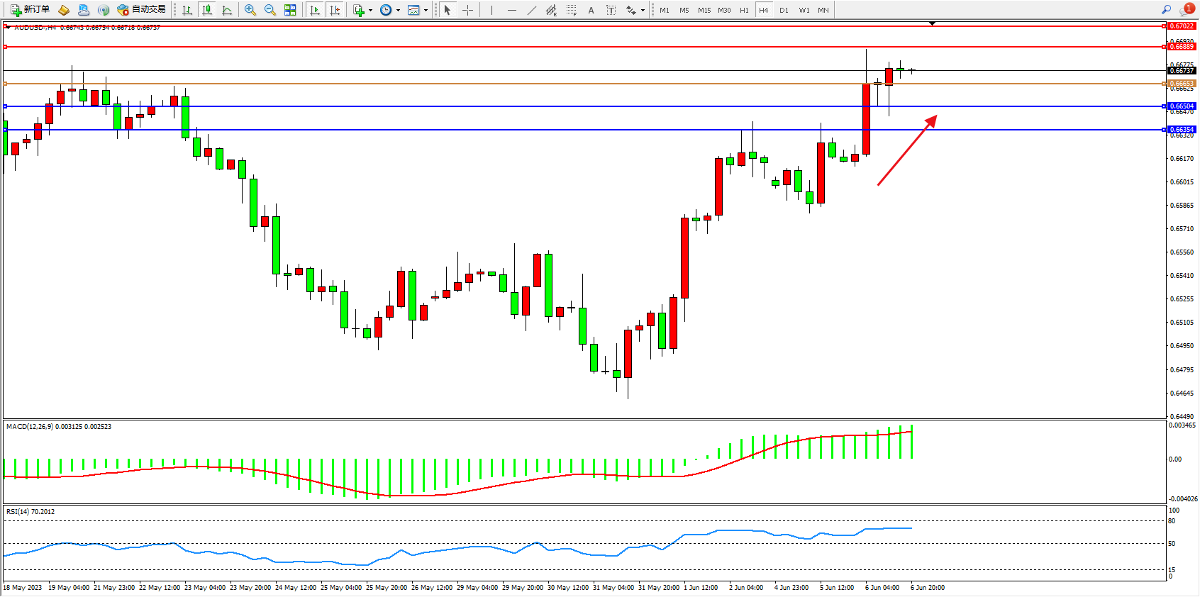 交易策略:0.66653上方看涨,目标0.66889  0.67022