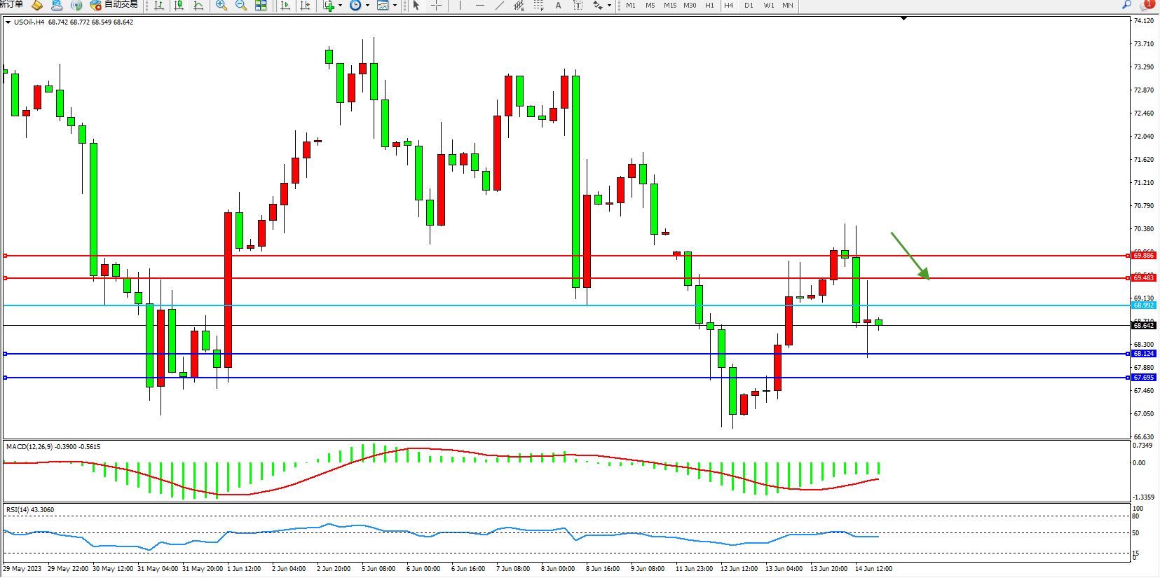 原油维持68.642附近震荡,美国至6月9日当周EIA原油库存 791.9万桶,预期-51万桶,前值-45.2万桶。美国至6月9日当周EIA俄克拉荷马州库欣原油库存 155.4万桶,前值172.1万桶。