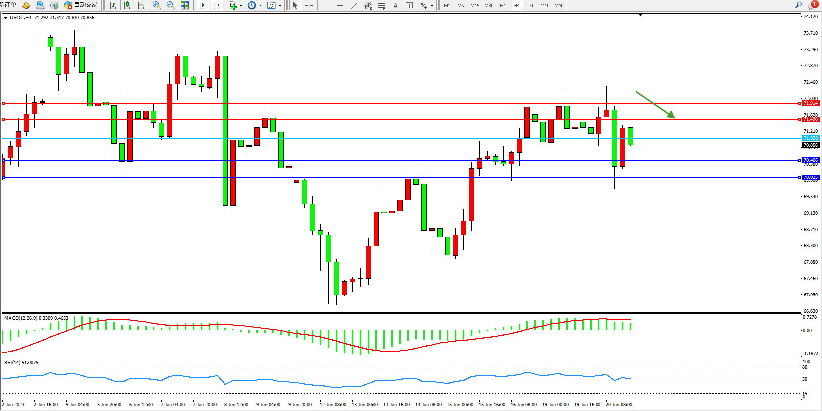 交易策略:71.020下方看跌,目标70.466  70.025