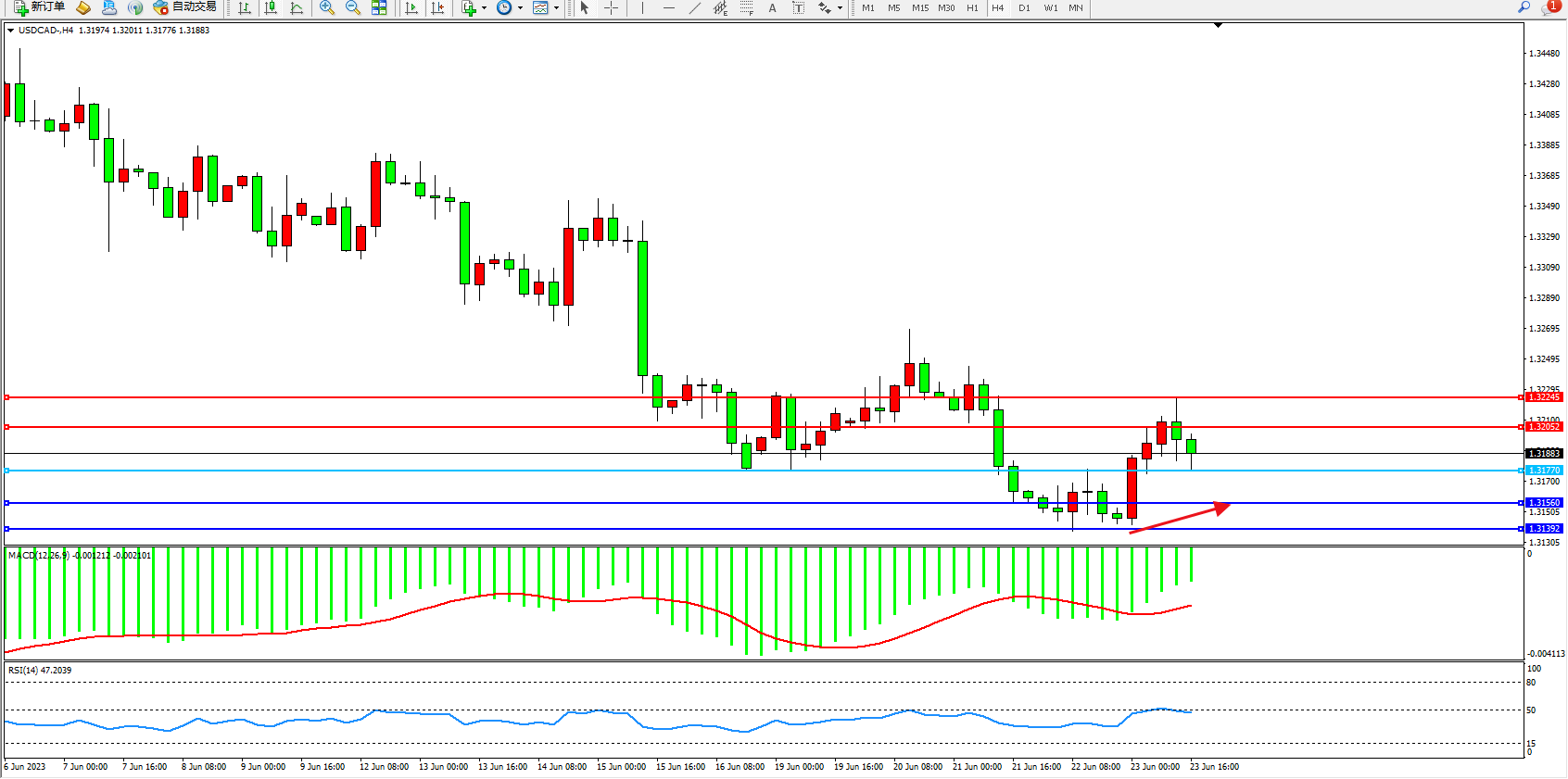 美元加元USDCAD——4小时K线图显示: