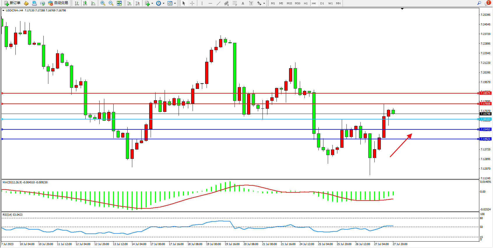 交易策略:7.16333上方看涨,目标7.17668 7.18575