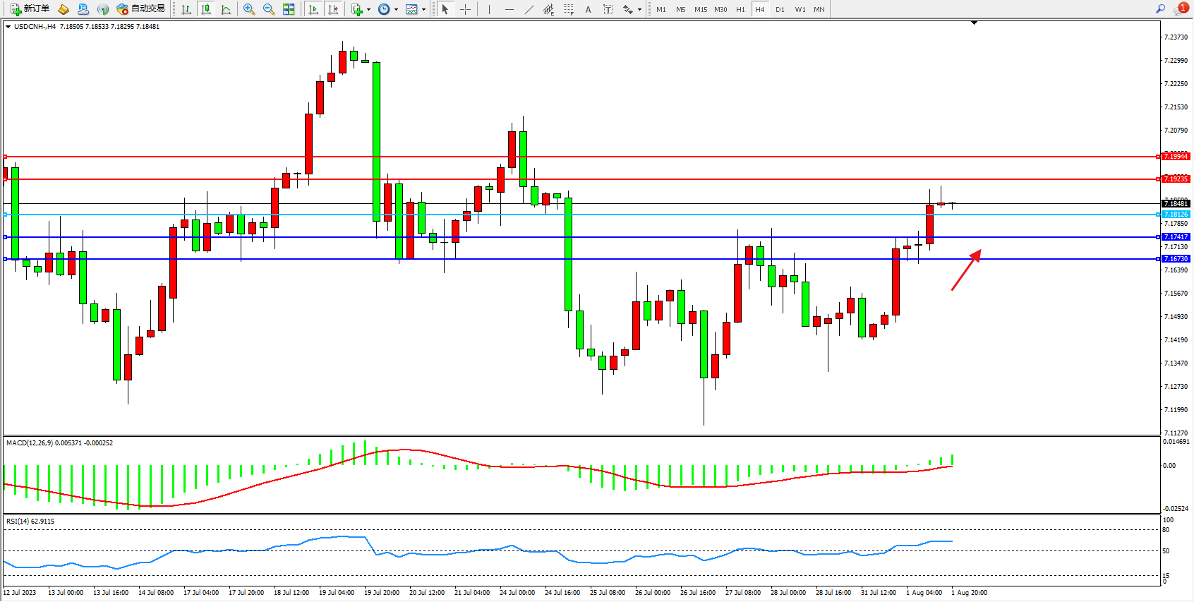 交易策略:7.18126上方看涨,目标7.19235  7.19944