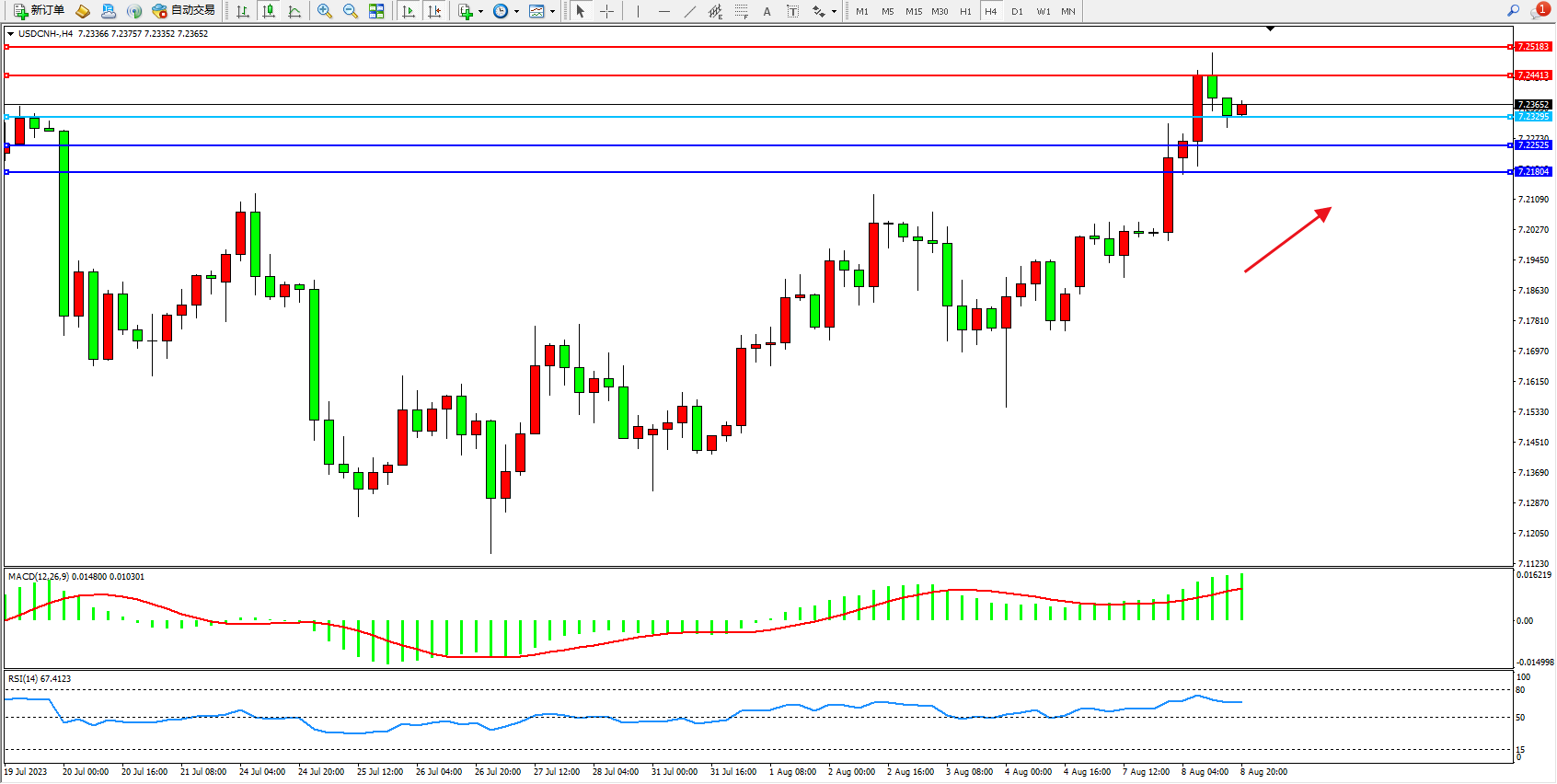 美元人民币USDCNH——4小时K线图显示: