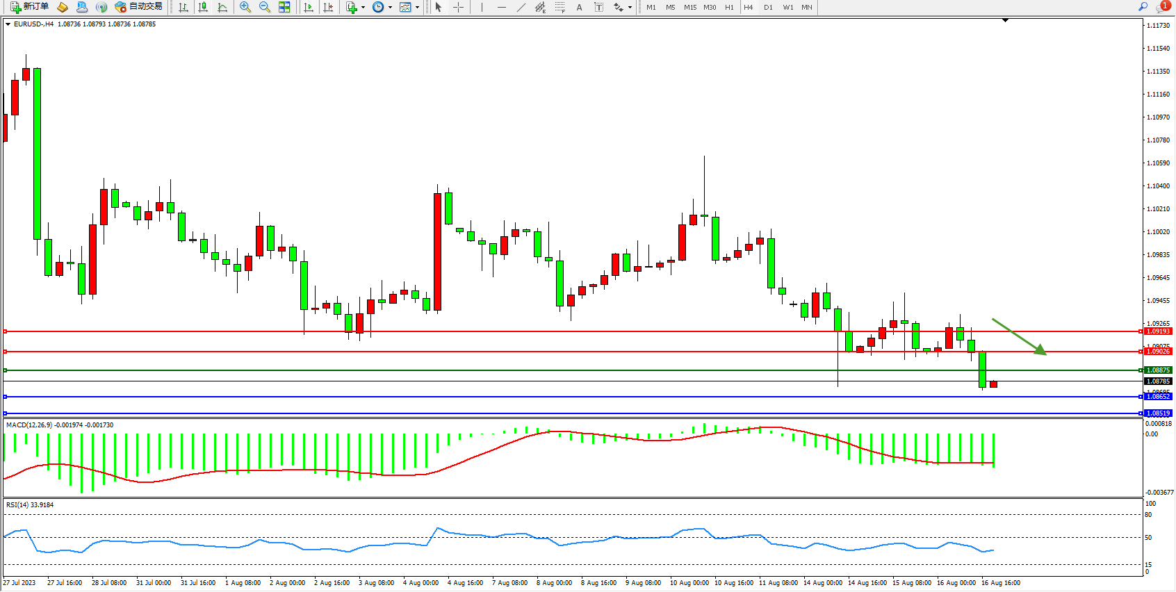 欧元美元EURUSD—4小时K线图显示: