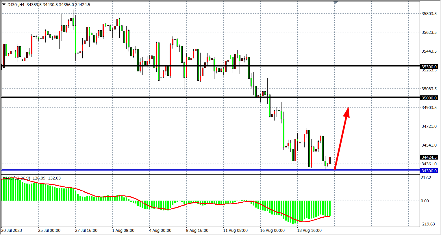 4小时图看,道指再度回落34300一线确认支撑,MACD维持在零轴下,行情出现短暂支撑,关注下方34300一线,阻力依旧关注34780-35000。