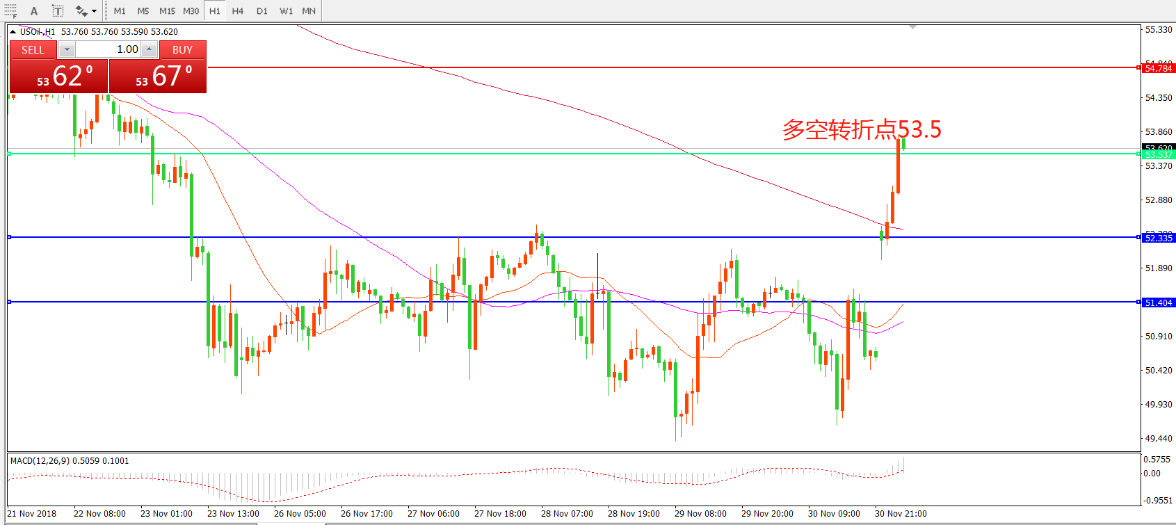小时图看,油价收G20利好消息影响,跳空高开并站稳前期阻力52.3,整体走势偏强,MACD绿柱缩短,红柱增加,短期以反弹做多思路对待。