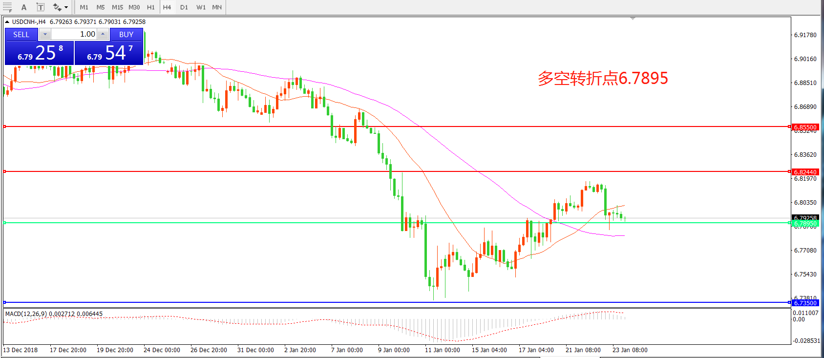 交易策略: 在6.7895之上,看涨,目标价位为6.8244,然后为6.8550。