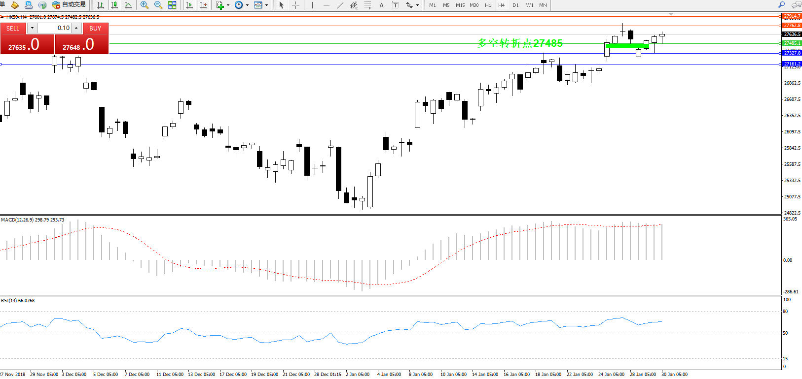 恒指HK50 ——4小时K线图显示: