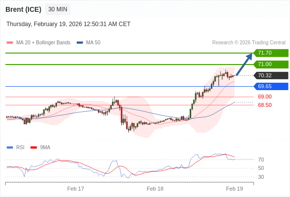 在 69.65 之上,看涨,目标价位为 71.00 ,然后为 71.70 。