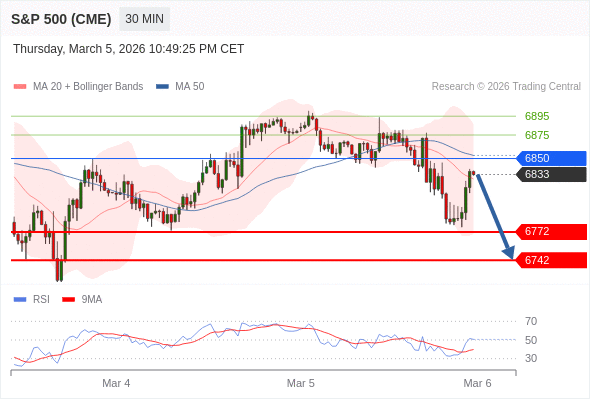 美国标普500指数期货 (H6) 当日内: 短期关键阻力位在6850。