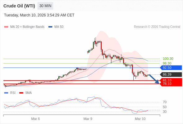 交易策略: 在 92.50 之下,看跌,目标价位为 81.10 ,然后为 78.10 。