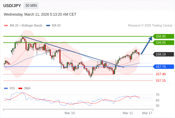 在 157.70 之上,看涨,目标价位为 158.65 ,然后为 158.90 。