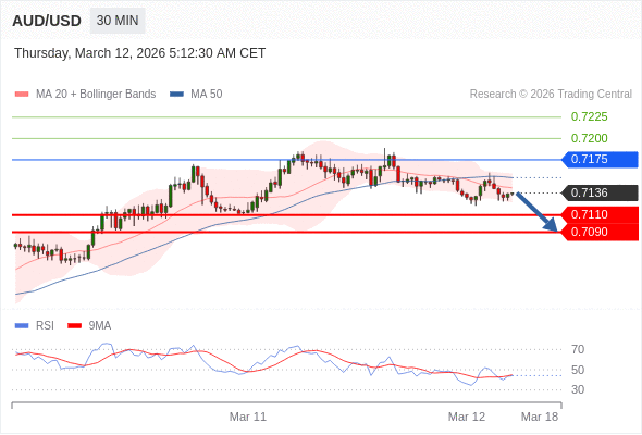 在 0.7175 之下,看跌,目标价位为 0.7110 ,然后为 0.7090 。