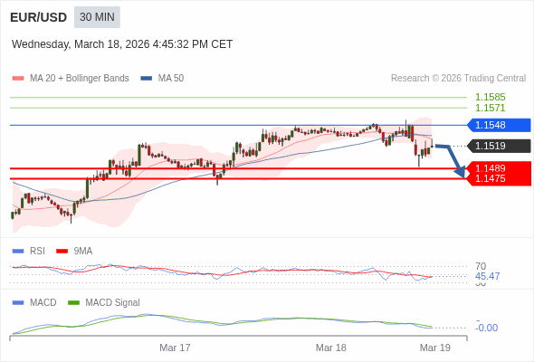 欧元/美元 当日内 : 看跌,在 1.1548 之下。