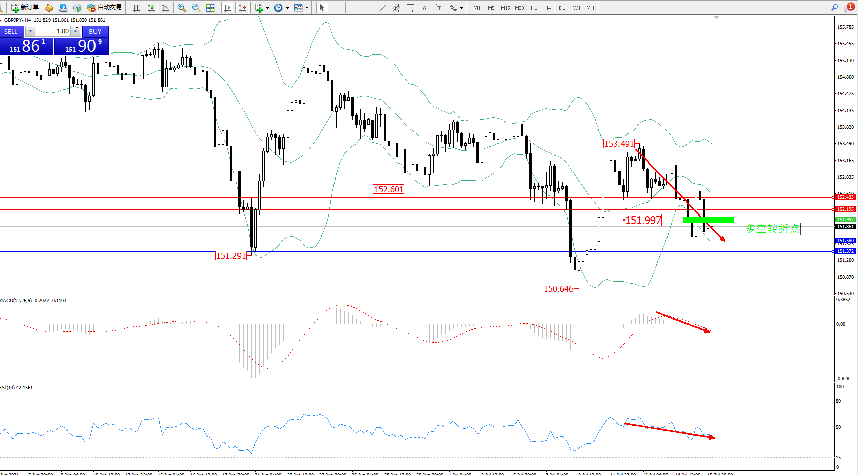 交易策略:151.997下方看跌,目标151.580、151.372
