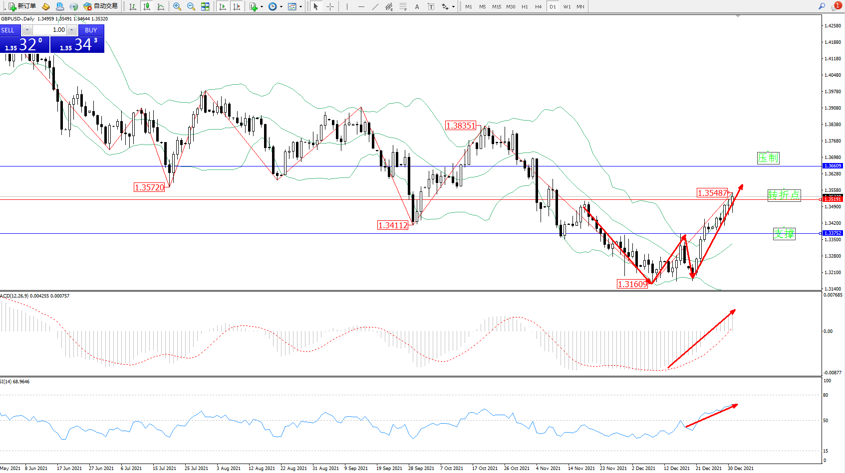 空头动力维持震荡下行至1.31609位置附近得到支撑后,多头动力伺机入场,短暂低位震荡后,开始延续布林带指标上轨附近不断震荡向上拉升中,多头动力持续攀升,尚未有最终止步迹象,上方压制关注1.36609附近,低位支撑关注1.33752附近,关注1.35191附近转折点,MACD指标低位多头动力维持震荡上移至0轴线上方不断拉升中,RSI指标纠结于50均衡线上方持续震荡向上移动中,如图: