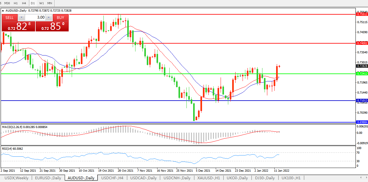 交易策略:0.7240上方看涨,目标0.7400、0.7550