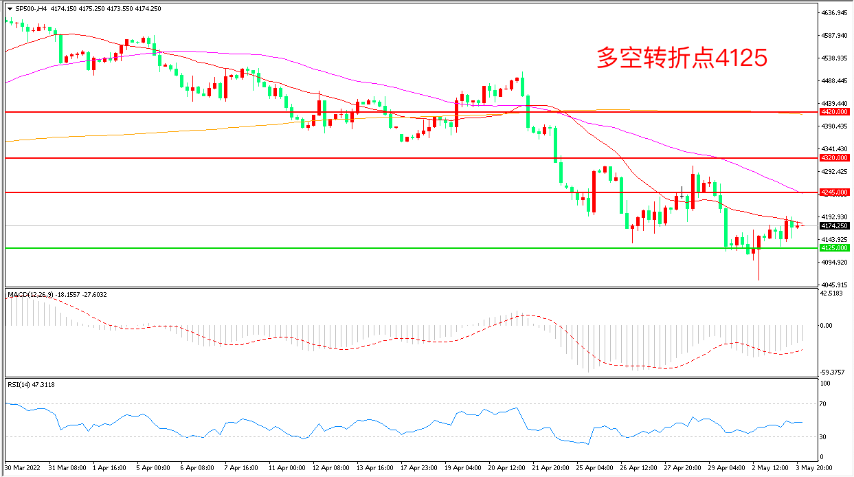 4小时图看,标普500以4125为依托小幅反弹,短期看有止跌迹象,但21周期均线依然成为上方阻力,MACD绿柱缩短,RSI指标走平,日内弱势震荡概率较大。