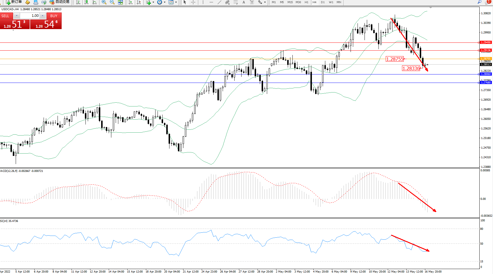 美元加元USDCAD——4小时K线图显示: