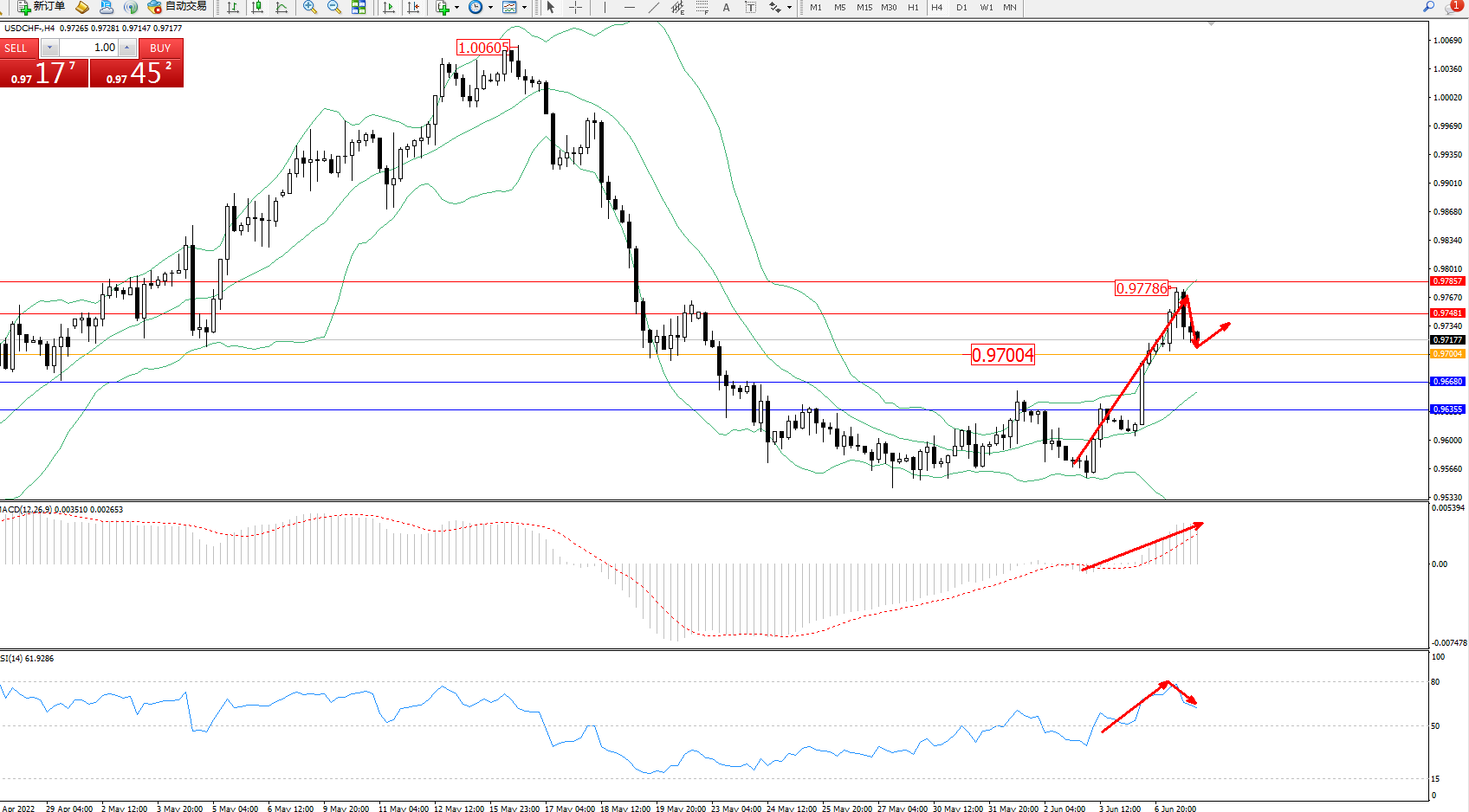 交易策略:0.97004上方看涨,目标0.97481、0.97857