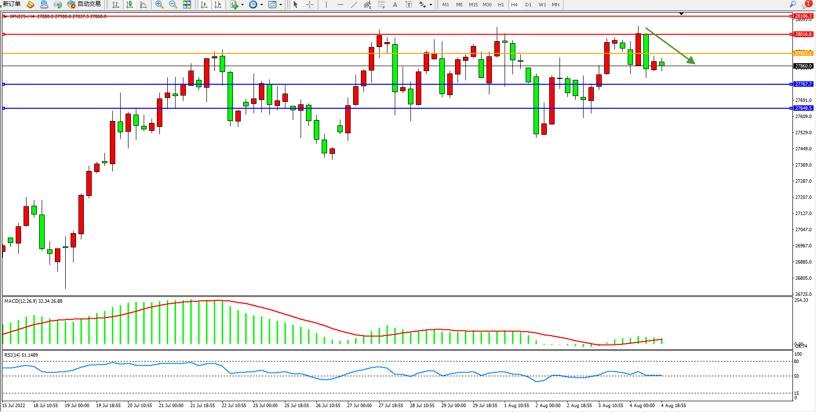 日经指数JPN225——4小时K线图显示: