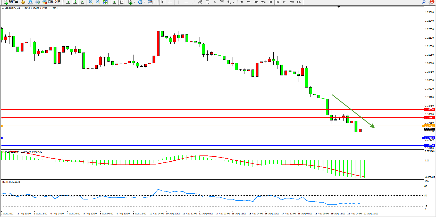 交易策略:1.17791下方看跌,目标1.17193、1.16834