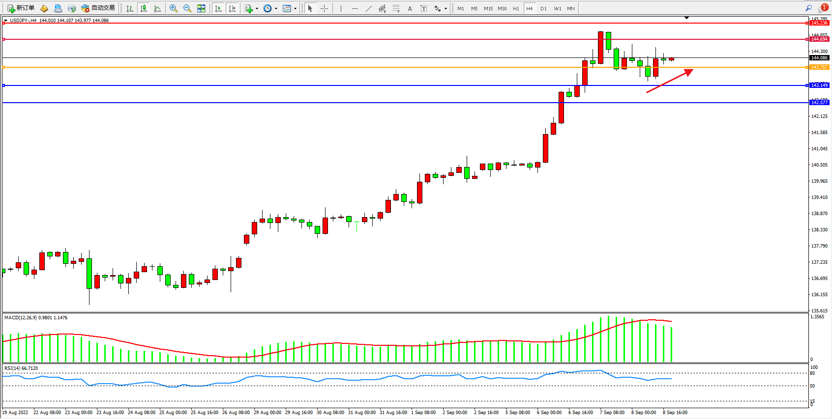 备选策略:143.757下方看跌,目标143.149、142.577