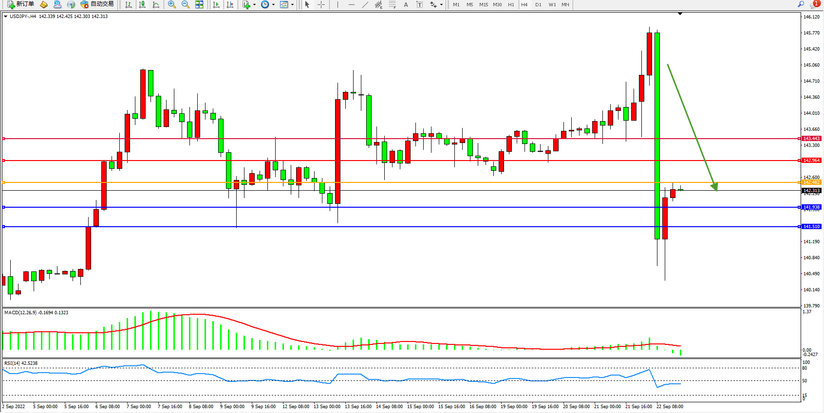 交易策略:142.482下方看跌,目标141.938、141.510