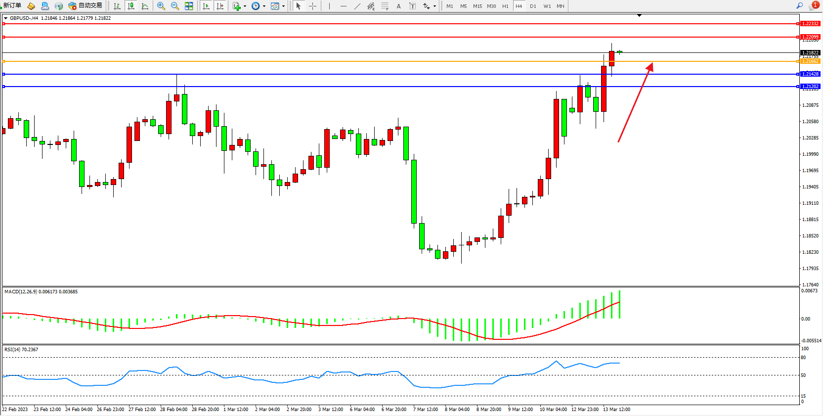 备选策略:1.21662上方看涨,目标1.22099  1.22332