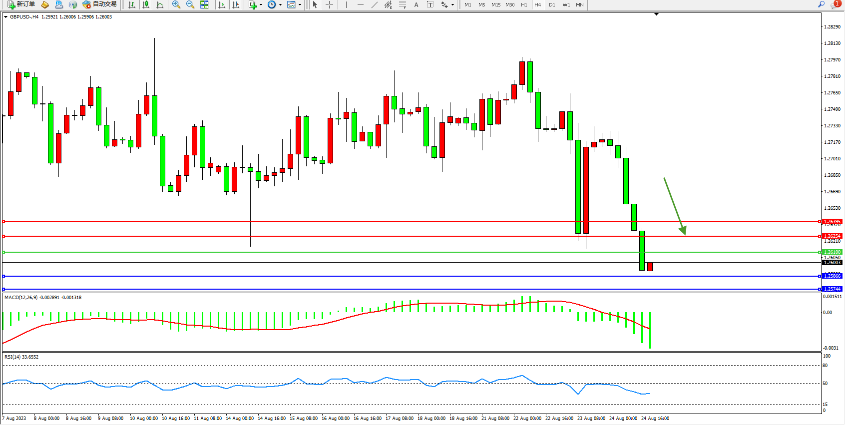 交易策略:1.26100下方看跌,目标1.25866 1.25744