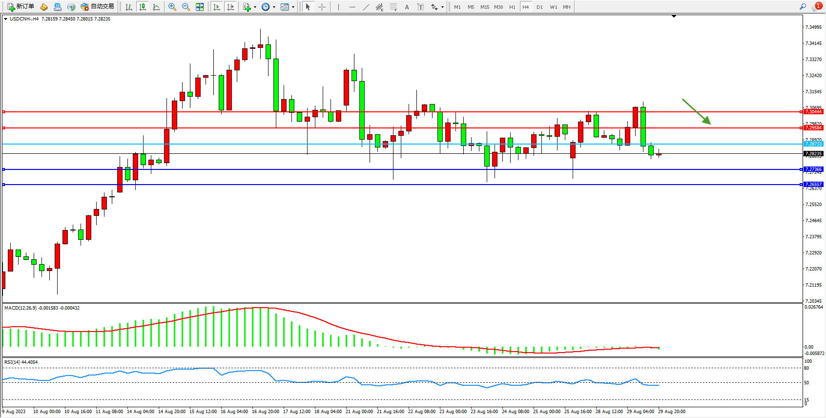 美元人民币USDCNH——4小时K线图显示: