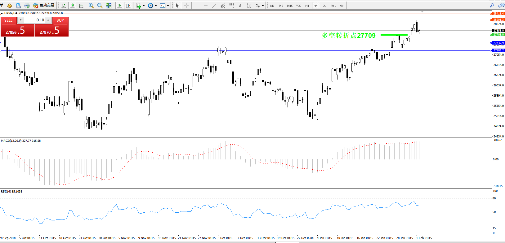 恒指HK50 ——4小时K线图显示: